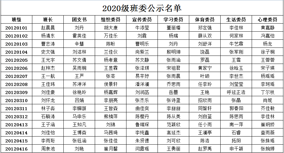 经班级民主评议,辅导员评议小组讨论,对2020级班委名单进行公示,公示期为:2020年10月27日9:30—2020年10月27日17:00,如有异议,请在公示期内到辅导员办公室x218和x211找张晓宾和张秀丽老师反馈或电话反馈:029-83209020(张晓宾老师)029-83208069(张秀丽老师)