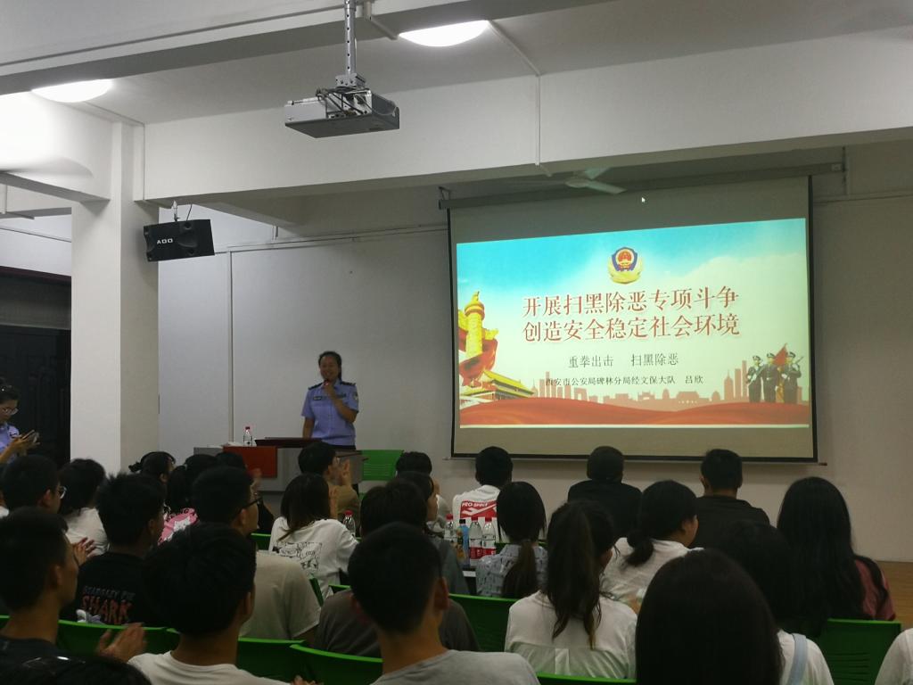 吕警官从扫黑除恶专项斗争讲起,借用视频向同学们介绍了国家重点打击的十二类黑恶势力违法犯罪行为,提醒同学们要认清黑恶势力,危急时刻要懂得运用正确的方式保护自己,不涉黑、不作恶。同学们积极参加问答环节,就重点打击的十二类黑恶势力违法犯罪行为、“打”黑变“扫”黑等问题积极互动。接着,吕警官向同学们详细讲解了网贷、校园贷、套路贷常用伎俩以及带来的危害。以触目惊心的真实案例提醒同学们认识校园贷的危险,告诫员工要远离校园贷,养成健康理性的消费观。