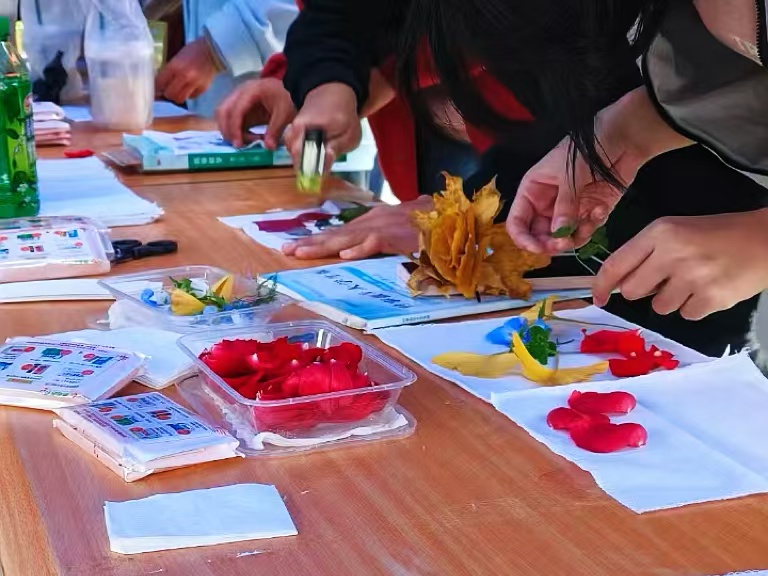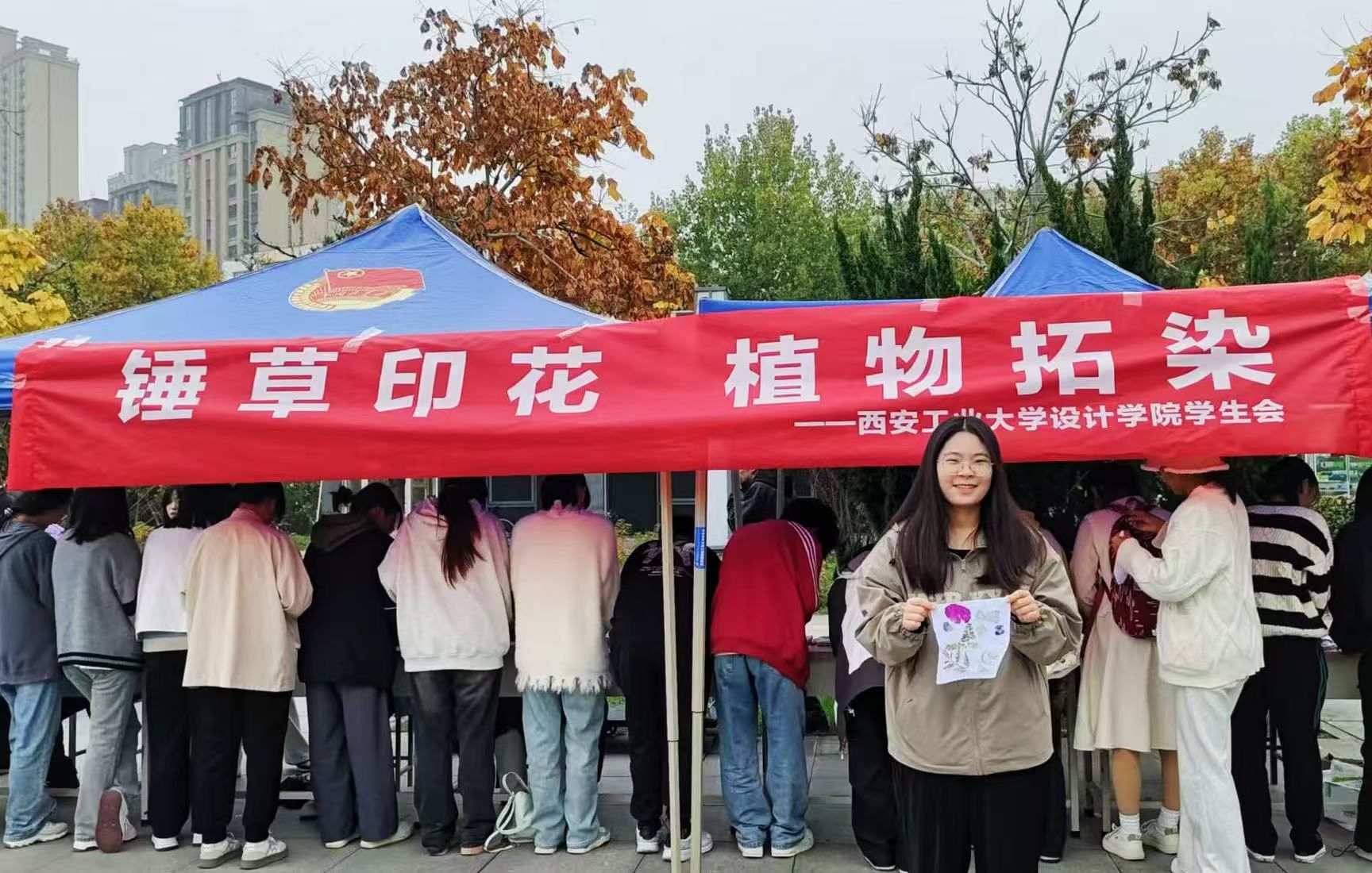 活动现场,工作人员为同学们介绍了植物拓染这一古老非遗技艺的历史背景、制作工艺以及注意事项,并为其准备了白色棉布手帕、橡胶锤、透明胶带、手套等必备工具。同学们敲打着植物,让植物的汁液渗透到手帕中,让西工的秋色在手中驻留。随着一幅幅别具一格的作品呈现在大家面前,参与活动的同学们纷纷表示,此次活动不仅让他们亲近自然,更体验到了传统非遗技艺的魅力。