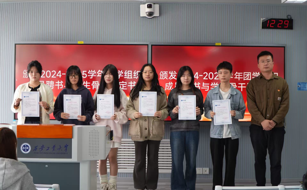 最后,许金鑫为上一届团学组织成员颁发聘书与员工骨干鉴定书,为新一届团学组织成员颁发聘书,并合影留念。