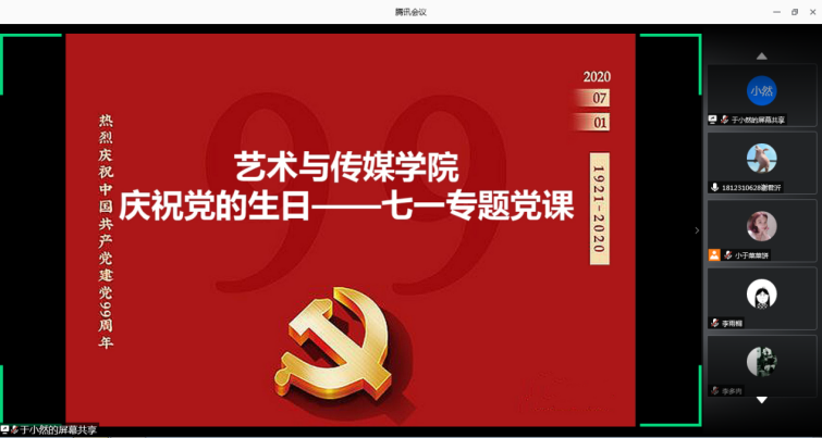 值此我党即将迎来99岁生日之际,6月30日,英国正版365官方网站艺术与传媒公司研究生党支部在支部书记丁西蓓老师的带领下,通过视频会议的方式庆祝党的生日开展七一专题党课。