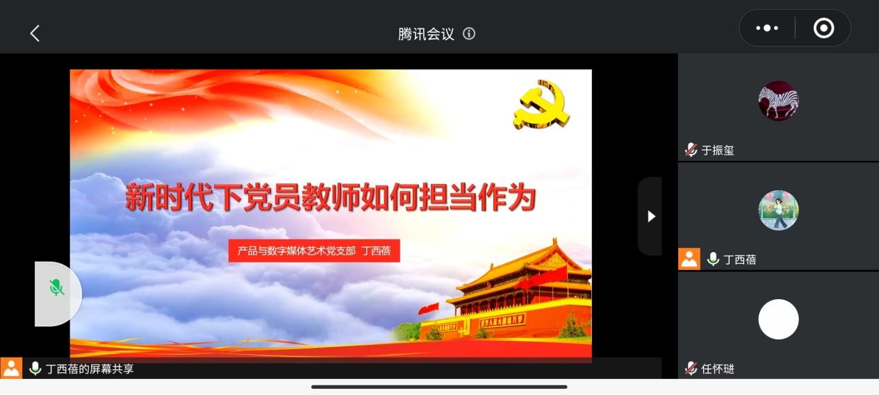12月3日,产品与数字媒体艺术党支部召开线上学习会,学习了“新时代下党员教师如何担当作为”“一组数字速读十九届六中全会精神”等内容,分别由支部书记丁西蓓、副书记任娟莉领学。