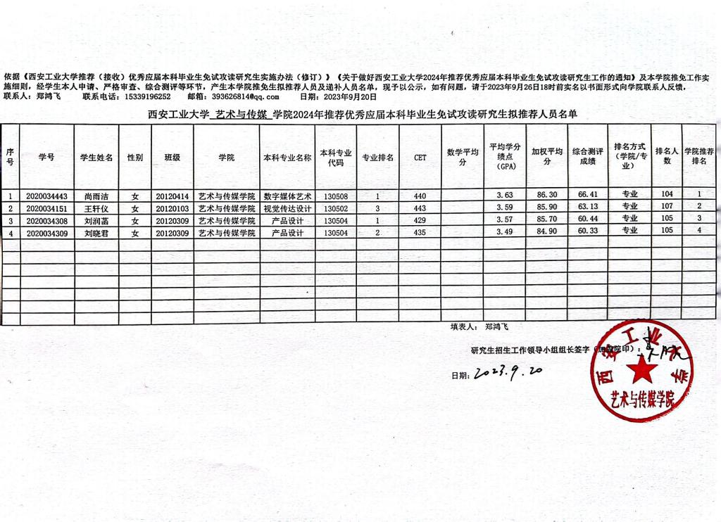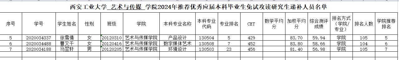 (公示)英国正版365官方网站艺术与传媒公司2024年推荐优秀应届本科毕业生免试攻读研究生递补人员名单