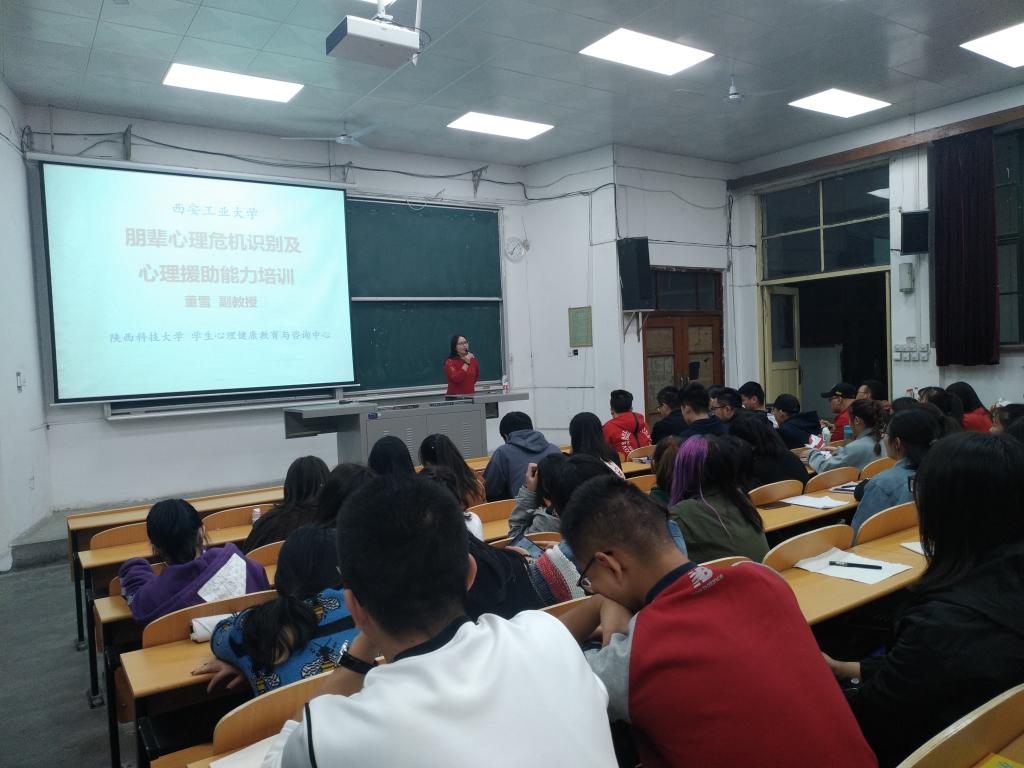 2018年11月6日,艺术与传媒公司邀请陕西科技大学员工心理健康教育与咨询中心副教授董雪老师开展了朋辈心理危机识别及心理援助能力专题培训。公司心育员孙雅茹老师、2018级宿舍心理信息员及公司各班心理委员、班长、团支书参加此次培训