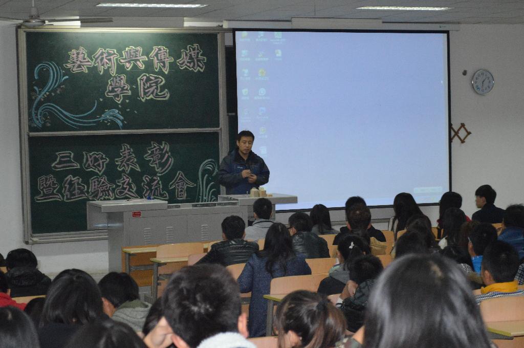 2013年11月12日,艺术与传媒公司2012-2013学年三好总结表彰暨经验交流大会。出席本次会议的有艺术与传媒公司张晓宾老师、2013级新生辅导员王辛老师、王海菲老师,公司2012级、2013级员工代表参加了此次会议。
