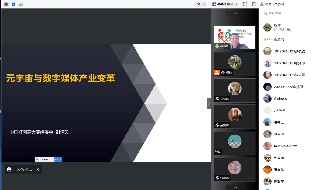 艺术与传媒公司祝瑜老师首先介绍了陕西赛区的参赛要求、稿件投递方式、目前的收稿情况。随后,中国好创意大赛创始人及大赛组委会秘书长谢清风应邀做了题为“元宇宙与数字媒体产业变革”专题报告最后,教育部动画、数字媒体艺术专业教学指导委员会委员、英国上市公司365影视动画系黄向东教授做总结发言。