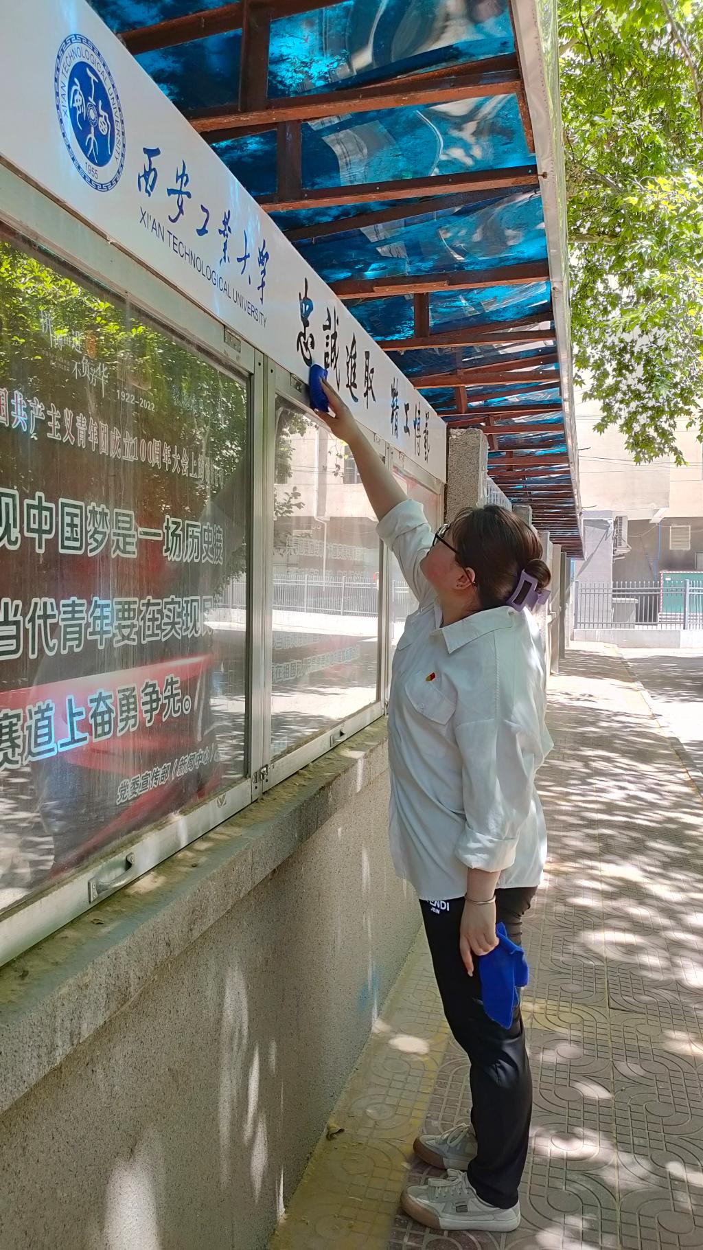 义务劳动,留一缕清香。全体毕业生党员在离校之际,自发擦拭清理金花校区西门校牌及校园内宣传橱窗,在劳动过程中,同志们充分发挥不怕苦、不怕累的精神,美化了校园环境,为绿色校园留下美丽背影。