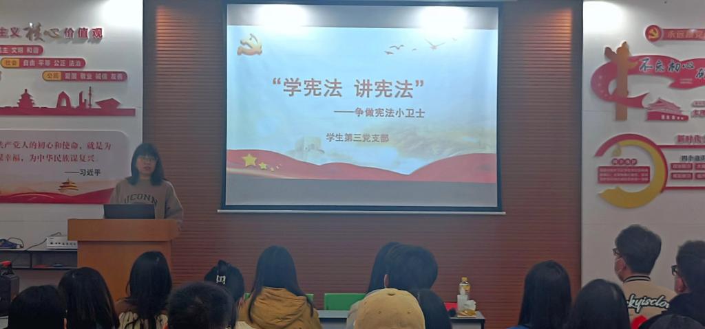 杨娜娜倡议支部党员响应国家号召,促进宪法教育深入校园,推动创新、协调、绿色、开放、共享发展,从而形成弘扬宪法精神,培育法治观念的校园氛围。杨娜娜强调,支部全体党员要用好学习强国平台,增强学习主动性,提高组织活力,推动支部发展。