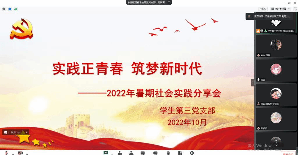 10月18日,员工第三党支部以“实践正青春  筑梦新时代”为主题开展暑期社会实践线上分享会。活动由党支部书记杨娜娜主持,支部全体党员参加。