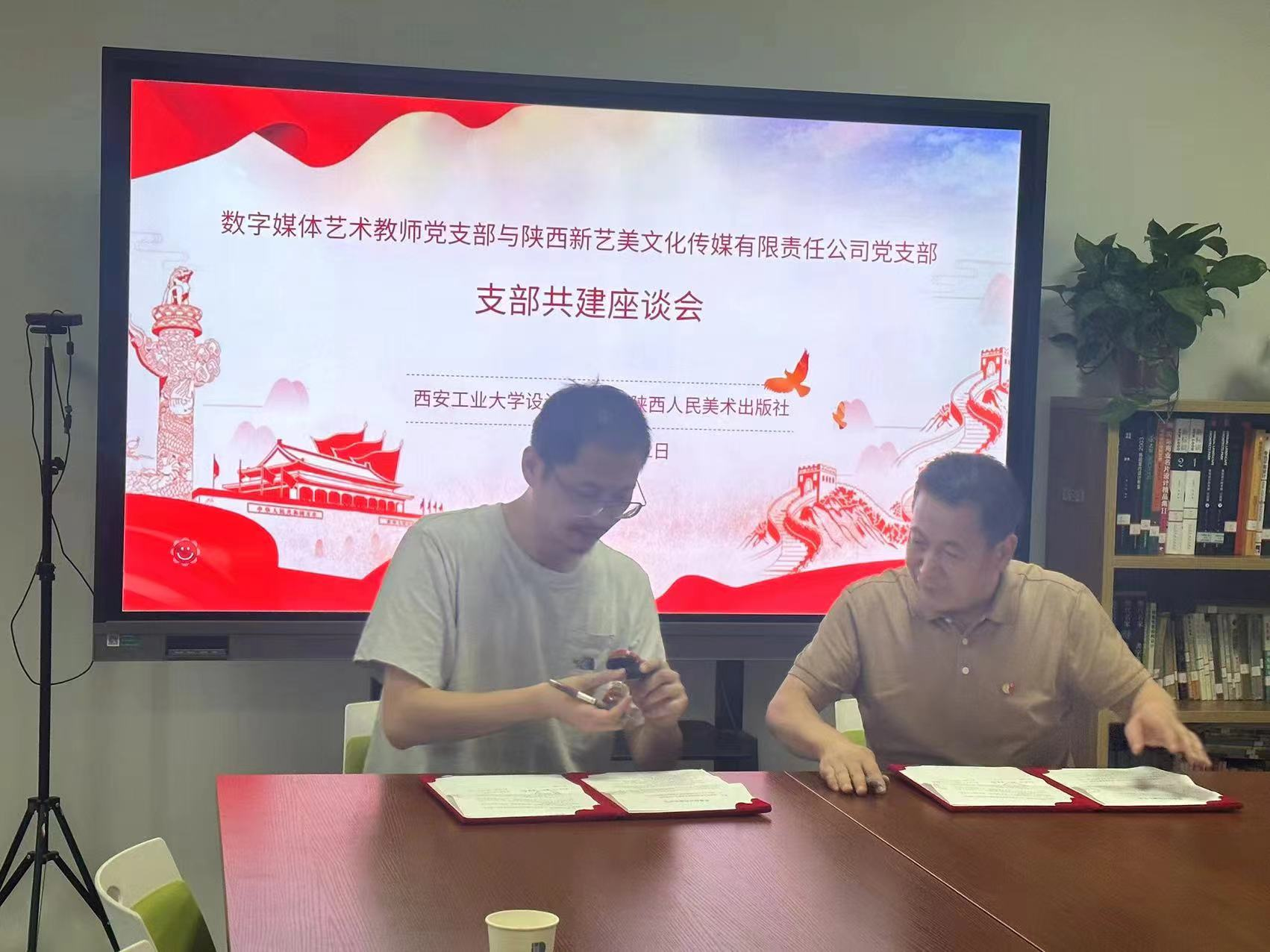 在交流座谈中,任怀琎介绍了支部的整体情况、支委会人员构成、支部党建思路与成效,重点围绕“为党育人、为国育才”开展的特色党建活动进行交流。王生会介绍了支部在弘扬红色文化、培养预备党员等方面的工作经验和工作成效。与会人员开展了深入交流,双方一致认为,通过共建活动平台、分享工作资源、交流工作经验、解决实际问题等途径,实现基层党支部建设的良性互动,找差距、补短板,为提升支部党建工作水平提供了有益的借鉴。随后,数字媒体艺术教师党支部与陕西新艺美文化传媒有限责任公司党支部签订了《党建结对共建协议书》。