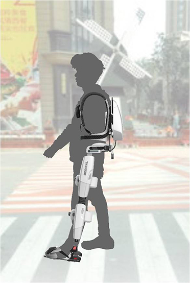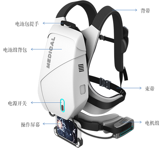 下肢康复外骨骼机器人将造型设计与功能系统相结合,对造型进行合理布局,兼具安全感和轻便感;在贴近人体背部的部位,避免了背部与背包的直接接触,背负与腰带、肩带、腿束采用软质橡胶和尼龙材质的设计,兼具支撑的柔和感和舒适感。在形态上,运用几何面及曲线对动力背包进行整体造型及模块进行分割,突出整体外观设计的简洁感;在分模方式上运用导角处理方式提升整体的精致感。在材质上,选用简洁素净、有质感的整体设计,兼具科技感和耐用感。在色彩上,整体色彩运用以白灰为基调的浅色系,体现出沉稳、柔和的感觉,让病患在使用时,体会到设计者的贴心和其中所传达的人文关怀,更有信心完成康复训练。